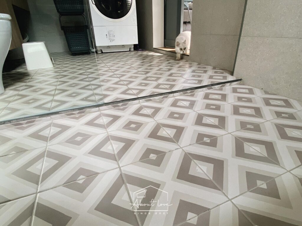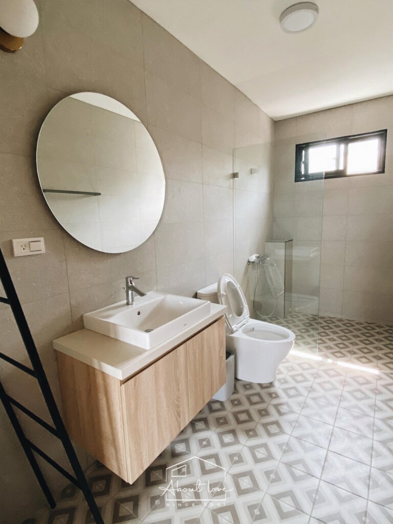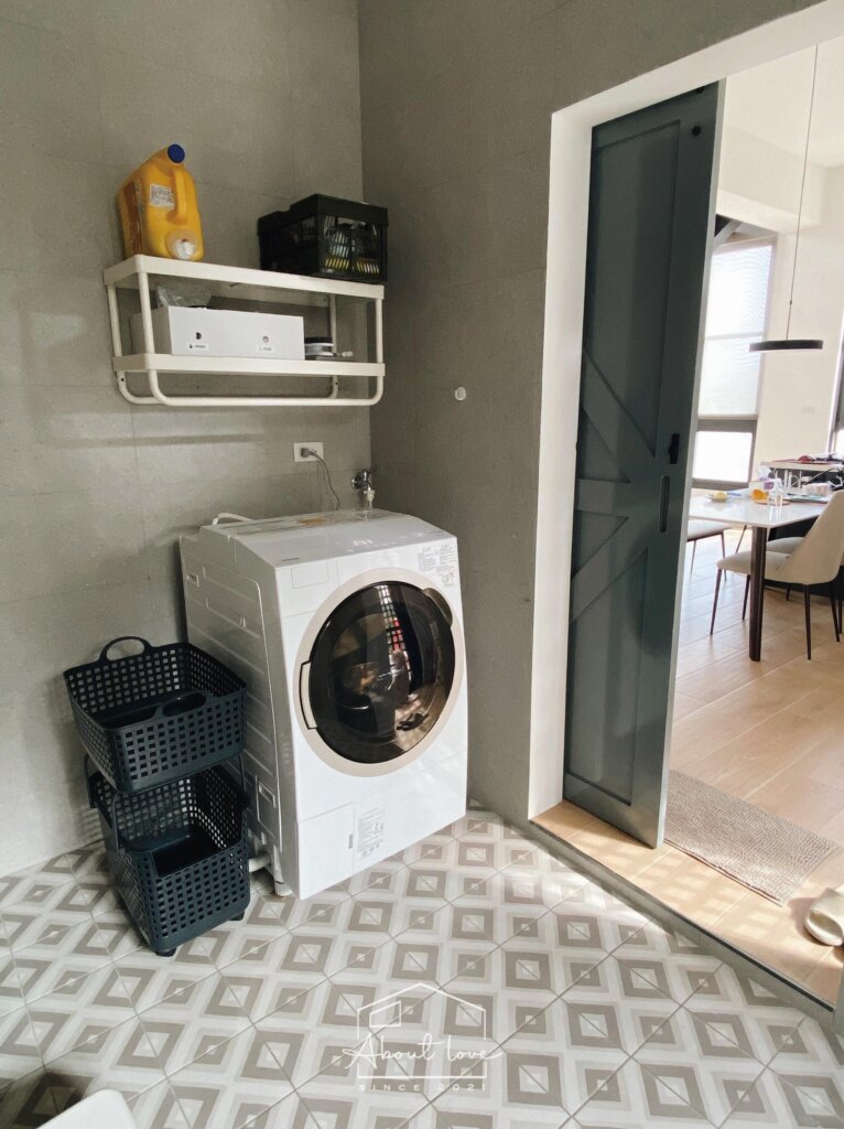 House 【 無裝潢居家設計 】灰色系浴室 x 家事空間 | 洗脫烘 8 11 月, 2022 / 1樓浴室當初規劃希望浴室入口及乾濕分離區不要有門檻,避免門檻漏水或矽利康發霉,選擇高低差的設計,目前使用上排水都沒什麼問題,清潔也方便很滿意! 乾濕分離區 直接不做門檻,用降板做2公分高低差,設置單片玻璃看起來清爽簡潔。每天家裡最後一個洗澡的人,使用刮刀將水漬刮除,就可維持玻璃透亮,不易產生水垢,清潔方便好整理。 浴室浴櫃 委託屏東東鴻廚具幫忙製作,木紋色發泡板搭配霧面石材,整體柔和優雅,發泡板較不用擔心日後碰水變形。收納上,洗手檯正下方的雙開櫃放置常用的盥洗備品、右手邊的淺抽收納保養品、眼鏡等小物,配合生活習慣規劃,使用起來非常順手。 家事空間 x 滾筒式洗衣機 因為生活習慣的關係,我將洗衣機放在浴室裡面,所以在水電圖要先留好出水孔跟排水孔。 當初聽朋友使用Toshiba熱泵式洗脫烘可以烘很乾,讚不絕口後,心裡就期待在浴室規劃一個家事空間。 考量浴室空間有限,加上配合生活習慣,我也跟進買了這台,在洗澡時將髒衣服丟到洗衣機就完工,雖然洗程大約3、4小時,但能告別晾衣服的日子,實在輕鬆愉快。 洗衣機的正上方,設置IKEA 的鐵製白色層架,結合吊桿的功能,可以收納洗衣用品、衣架及家事用品。 旁邊的日本 lIke-it雙層洗衣籃帶有滾輪,可以推到洗衣機前方放衣服很方便,也能分層拿取提籃晾衣服使用。 1樓鋁框方鏡、2樓無框圓鏡 皆從網路購入,選用無銅鏡,日後較不容易有黑斑,台灣業者製作的,不論是無框的還是有框的品質都非常優質,收邊都美。 2樓浴室:當初沒有注意到因爲糞管的關係,地面會墊高大約18公分,後來才知道可以事先規劃降板,如果一樓天花板降低一點,2樓浴室入口就不會有這麼大的高低差,比較方便進出,提供給大家在規劃時參考。